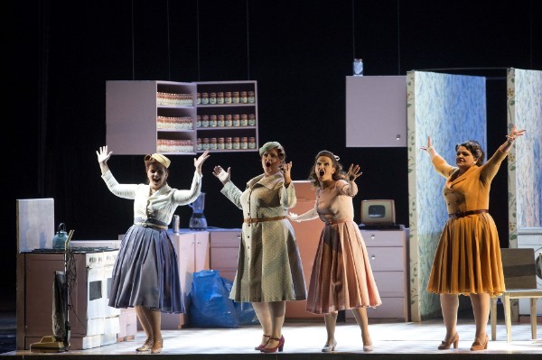 Noch vor Beginn der Oper kann man auf der Bühne den Rahmen eines riesengroßen alten Fernsehapparates aus den frühen 60ger Jahren sehen. Darin sitzt unbeweglich Sir John Falstaff. Wenn die Musik anhebt verdunkelt sich die Bühne und gibt den Blick frei auf das geradezu fürstlich ausgestattete Garter Inn, dessen Wände mit Genrebildern und allerlei Geweihen geschmückt sind. Das Quartett der vier Damen ist im zweiten Bild des ersten Aktes dann mit Hausarbeit, wie Staubsaugen und Aufräumen, beschäftigt. Die weit ausladenden Röcke mit hochgezogener Taille in rosa, hellgelb und hellgrün weisen auf die späten 50er bis frühen 60er Jahre hin. Ob die Damen darunter auch den zeitgenössischen Petticoat getragen haben, war leider nicht festzustellen… Mrs. Quickly, in knallroten Pömps und rotem Hut erscheint um Falstaff mit ihrem unvergleichlichen “Referenza” zu einem gemeinsamen Stelldichein mit Alice und Meg zu verführen. Falstaff kann seine Hände auch nicht von ihr lassen und ein herzhafter Aufschrei aus dem Off ist im Zuschauerraum vernehmbar. Ford erscheint dann standesgemäß im Schottenkilt und erfährt so von dem beabsichtigten heimlichen Treffen von Falstaff mit seiner Gattin. Er selbst gibt sich freilich als Fenton aus und beschwört Falstaff, Alice, die er heimlich verehre, für ihn zu gewinnen. Falstaff willigt ein. Turbulent ist dann die Szene in Fords Haus, wo alle auf der Suche nach Falstaff hin-und herrennen. Dieser, im berühmten Wäschekorb versteckt, landet schließlich mit der Schmutzwäsche in der Themse. Durchnässt in seiner Unterkunft kann ihn die botfährige Mrw. Quickly zu einem neuen Rendevous mit den beiden Damen im Wald von Windsor überreden. Dortselbst möge er sich als Schwarzer Jäger verkleidet um Mitternacht einfinden…