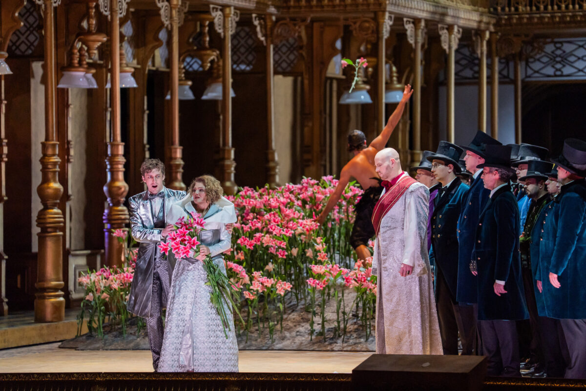 Diese beiden bestreiten auch stellvertretend für Lohengrin und Telramund den Kampf. Der dritte Schwan hält sich im Hintergrund, bis er zur Abreise von Lohengrin herbeigeholt wird und schließlich als Gottfried eine neue Ära verheißt. Als erlösende Hoffnungsgestalt darf dieser neue Herrscher von Brabant allerdings bereits während der Ouvertüre in Erscheinung treten. Der Regisseur ist also an einer chronologischen Erzählung der Geschichte nicht so sehr interessiert? Das Bühnenbild von Sebastian Hannak zeigt eine zur Bühne hin offene Halle, die britischen Kaufhäusern des 19. Jhd. mit ihren Metallkonstruktionen in Gold nachempfunden sein mag. Eine große Brücke im Vordergrund dient dem Auftritt der Protagonisten, eine Galerie jenem des Chores. Krisztina Lisztipád entwarf die eleganten Kostüme der Männer mit ihren britischen Top-Hats und die vor allem bunten Kostüme eines Teiles des Damenchores, während der andere Teil völlig in grün gewandet an eine illustre Jagdgesellschaft erinnerte. Den 2. und 3. Akt dominiert eine bühnenbreite Box mit einer schwarzen Seite für das Intrigantenpaar mit Video-Überwachungskameras und Flachbildschirmen. Zur Rechten das goldene Schlafzimmer für Elsa und Lohengrin. Wobei wir bei der Besetzung der Hauptpartien angelangt sind. Zusammengefasst kann man sagen, dass die rein ungarische Besetzung am Vormittag des 16.11., die auch vom ungarischen Fernsehen aufgezeichnet wurde, über weite Strecken besser war als die mit internationalen Gästen gespickte und im Vorfeld bereits gehypte Aufführung des Vorabends.