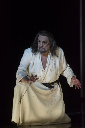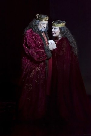 Ich kann mich noch sehr gut an die hämischen Kommentare der Profijournalisten erinnern, als diese Inszenierung von Peter Stein 2011 in Salzburg herauskam. Es wurde moniert, dass das Geschehen einfach so gezeigt wird, wie es abläuft. Na so was! Ist ja auch eine Schande, die Geschichte zu erzählen, wie sie geschrieben wurde! Ich persönlich habe die Regie jedenfalls genossen, auch wenn ich mir vorstellen kann, dass das karge Bühnenbild von Ferdinand Wögerbauer (das von der Beleuchtung durch Joachim Barth enorm profitierte) in der Felsenreitschule noch mehr Eindruck machte. (In Valencia war die in Rom für eine normale Opernbühne adaptierte Fassung zu sehen). Gut organisiert die verschiedenen Aufmärsche, ausgezeichnet gelöst der Übergang des Chors „O patria oppressa“ zur Arie des Macduff. Einzig die Art, wie Bancos Sohn den Häschern entkam, wirkte etwas ungeschickt – allerdings habe ich für diese Szene, in der ein Knabe einer großen Gruppe von Mördern entwischt, noch nie überzeugend dargestellt gesehen. Jedenfalls war die Atmosphäre finsteren, blutrünstigen schottischen Mittelalters bestens getroffen. Und die von Männern dargestellten Hexen waren in ihren beiden Szenen überhaupt ein schauriger Höhepunkt. Die historisch inspirierten Kostüme von Anna Maria Heinreich ergänzten das positive Bild.
