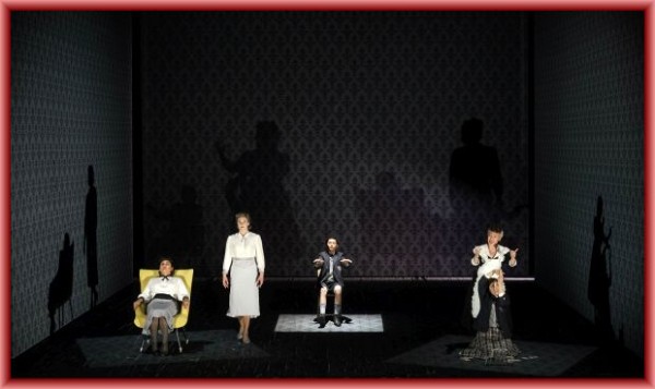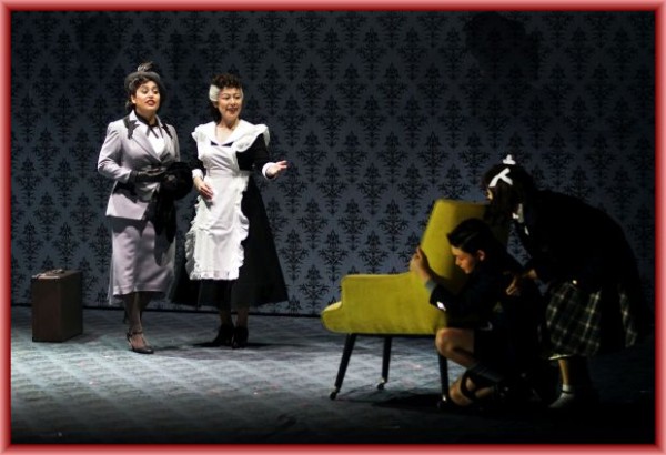 Die hier besprochene gab mir allerdings das Gefühl, die Auslegung des Stoffes gesehen zu haben, auch wenn dies im Kontrast zum zuvor Gesagten steht. So spannend, so wie ein Thriller von Hitchcock war das Ganze, dass man die Dauer von einer Stunde und 50 Minuten gefesselt auf seinem Sitz saß und fast aufs Atmen vergaß. Die 16 Szenen endeten jedes Mal mit dem Schließen des Vorhangs, was das unerbittliche Fortschreiten der tragischen Handlung betonte. Das Bühnenbild von Manuel Zuriaga bestand aus verschiebbaren Wänden mit einem Tapetenmuster, das wohl harmlos und dem Geschmack der Zeit geschuldet schien, aber in Wirklichkeit die erstickende Bedrücktheit der Story unterstrich. Den verschiedenen Szene entsprechend rückten diese Wände einander näher oder bildeten geometrische Formen, die mit der ausgezeichneten Lichtregie von Nadia García und Antonio Castro immer bedrückender erschienen. Genial gelöst die Szene mit Miss Jessel, in der die Erzieherin in ihrem Bett schief an der Wand hängt, um die Alptraumhaftigkeit dieser Erscheinungen der Toten zu unterstreichen. Auch Mrs. Grose erhält einen unheimlichen Touch, denn ihre hoffnungsvollen Worte erscheinen irgendwie nicht ehrlich.