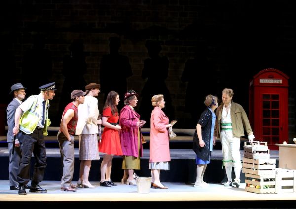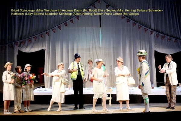 Die aktuelle Produktion entstand in Zusammenarbeit mit dem Tiroler Landestheater, an dem die damalige Intendantin Brigitte Fassbaender im Jahr 2012 für die Regie gesorgt hatte. Unterstützt von Bettina Munzer (Bühnenbild und Kostüme) frischte sie die Inszenierung nunmehr an der Volksoper neu auf. Die Handlung spielt in einem Fast-Einheitsbühnenbild mit den üblichen Versatzstücken einer englischen Kleinstadt: Die rote Telefonzelle, der ebenso rote typische Postkasten, der kleine Gemüseladen mit Registrierkasse, im Hintergrund die drohenden Scherenschnitte der Tugendwächter, ein Serpentinenweg nach vorne, der für den Handlungsablauf geschickt genutzt wird, die Kostüme an der Grenze zur Persiflage mit dem notwendigen Mief des Konservativen. Fassbaender zelebriert die pausenlose Situationskomik des Stückes, sie zeichnet aber alle Figuren an der Grenze zur Parodie. Rosamunde Pilcher, Inspector Barnaby und Agatha Christie lassen grüßen! Wem diese Sicht auf England gefällt, der wird sich in den 2 ¾ Stunden gut unterhalten, mir war diese Sichtweise zu vordergründig und zu eindimensional. Die Reaktion des Publikums war jedoch positiver, wobei zu vermerken war, dass kaum eine Premiere an der Volksoper so schlecht besucht war wie die aktuelle. Was auch Befürchtungen hinsichtlich der kommenden Auslastung aufkommen lässt, aber das nur am Rande. Denn diese Oper von Britten ist durchaus wert entdeckt zu werden.