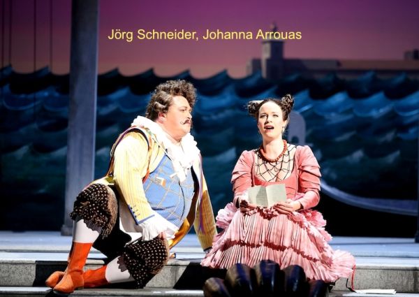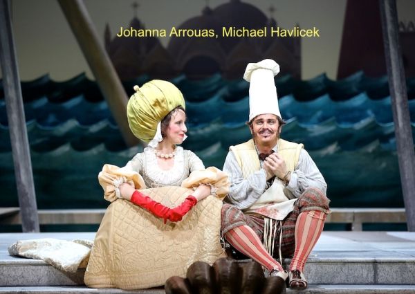 Die verwinkelte Handlung der Verwechslungskomödie fasste Horstkotte (der ursprünglich vom Puppentheater kommt, was auch hie und da durchklingt) im Programm in einen Satz zusammen: Herzog will eine vernaschen, kriegt stattdessen zwei andere aufgetischt, und keine der drei wird verspeist. Und eben dieser Herzog ist natürlich mit Vincent Schirrmacher ideal besetzt. Der Tenor, der manchmal zum Forcieren neigt, zeigte in dieser Rolle die ganze Bandbreite seiner Stimme und vermied auch in seiner Darstellung als verführerischer Adeliger jedes Abrutschen in die Outrage. Sein Leibbarbier Caramello bzw. Jörg Schneider musste sich mit seinem Auftrittslied erst auf der Bühne akklimatisieren, aber bei den folgenden „Hadern“ – wie dem Gondellied oder dem Lagunenwalzer – war seine feine Stimme mit eleganter Linie wieder voll präsent. Überrascht konnte man feststellen, welche Substanz der Bariton von Michael Havlicek hat, der dem Makkaronikoch Pappacoda sympathische Züge verlieh.