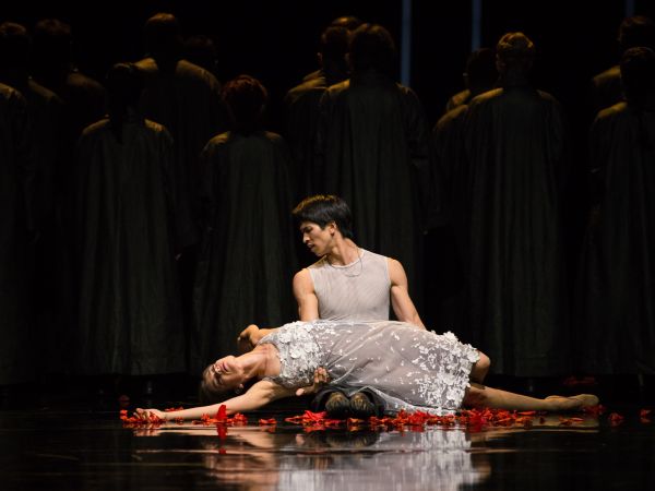 Nicht nur das Tanzensemble ist auf der Bühne präsent, auch der Chor „spielt mit“, einbezogen ins Geschehen, desgleichen die drei Sänger: Annely Peebo hat eine längere Passage zu Beginn, wandert schwarz gekleidet und blondhaarig über die Bühne, tröstet Julia. Kürzer ist der Beitrag des Tenors (Szabolcs Brickner), während der Baß (Yasushi Hirano) am Ende über den Toten das große Lamento anstimmt, das Lorenzo dann tanzt…