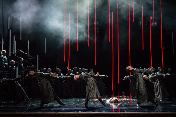 Kurz, der Choreograph muss seinen eigenen Weg finden, Teile der berühmten Geschichte zu erzählen – und Davide Bombana ist da gar keine Kompromisse eingegangen, dem Publikum verständlich oder auch ästhetisch entgegen zu kommen. Wesentlich geprägt wird sein Abend von der Ausstattung von „rosalie“, der deutschen Allround-Künstlerin, deren exzentrischen Bayreuther „Ring“ (ab 1994, Alfred Kirchner / James Levine) man nicht nur wegen der seltsam abgeflachten Krinolinen für die Damen nicht vergessen wird… „rosalie“ starb heuer, die Ausstattung für das Werk wurde fertig. Es verfremdet mit hängenden Lampenröhren, mit Lederkostümen, vielfach mit Masken für den Chor und Tänzer, teils abstrakt wirkend. Am Ende trägt der Chor Regenmäntel, bevor diese am Ende abgeworfen werden und die Sänger in bunten Gewändern erscheinen – Symbol für die Versöhnung (und wie oft schon da gewesen?). Die Lichtregie, auch von rosalie entworfen, taucht die Szene in fast permanente Dunkelheit, in dämonische Düsternis.