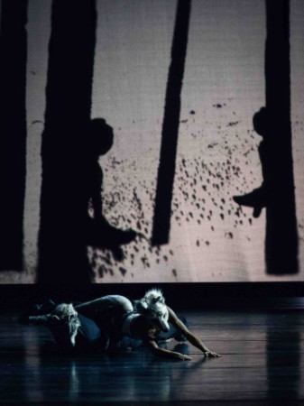 Mit grosser Spannung wurde die Uraufführung „Between Dogs and Wolves“ von Pontus Lidberg erwartet. Und wenn im Programm bereits „Das Rudel bei den Proben“ steht, kann man sich auch humoristische Elemente erwarten. Zum Streichquartett Nr. 10 von Dmitri Schostakowitsch hebt sich der Vorhang und neun reizende Mädchen in weissen Tutus (Kostüme: Rachel Quarmby-Soadaccini) tanzen idyllisch in der Abenddämmerung, die Videoprojektionswand (Jason Carpenter) im Hintergrund zeigt Baumstämme, man befindet sich wohl im Wald. Passend zur spannungsgeladenen Musik taucht auf einmal ein Wolfsschatten auf der Projektion auf, und hinter der Wand kommt ein Herr im Anzug hervor, ein steter Wechsel von Soli und Ensemble hält das Publikum in Bann, dazwischen ein gekonntes Spiel mit der Projektionswand, die einen zwischen zwei Welten gefangen hält, die charakterstarke Rebecca Horner mutiert nach kurzer Zeit zu einer verspielten, geschmeidigen Wölfin mit Wolfsmaske und Pfoten, Nikisha Fogo zeigt sich von ihrer lieblichen, aber dennoch sprungkräftigen Seite, Ioanna Avraam und Jakob Feyferlik zeigen ästhetische, fliessende Figuren im Pas de deux, Nina Polakova bezaubert ebenso wie die flinken Herren Davide Dato und Navrin Turnbull. Keck jagen die Herren die Damen, eine Dame geniesst es, von drei Herren umworben zu werden. Eine konkrete Inhaltsangabe gibt es nicht, die Zuschauer sind selbst aufgefordert, ihrer Phantasie freien Lauf zu lassen.