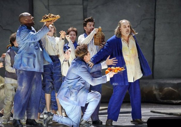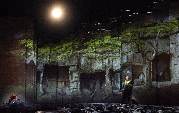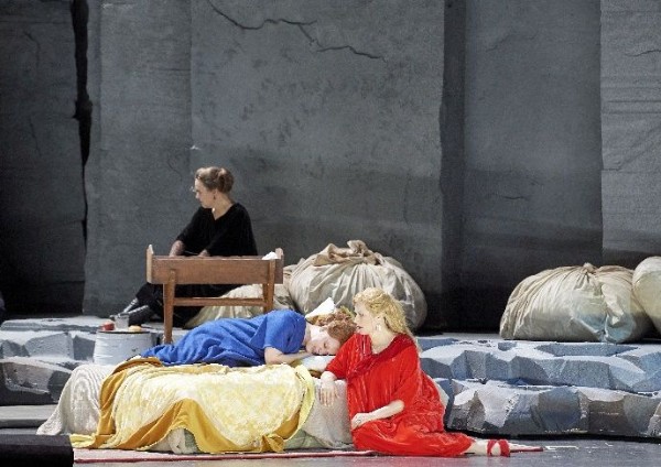 Der junge und wohl als Regisseur – wenn man den Lebenslauf liest – in großer Oper noch nicht sehr erfahrene Vincent Huguet, zunächst Kunsthistoriker und Verleger, nutzt bis auf eine Ausnahme diese Technik nicht, ähnlich wie Sven-Eric Bechtolf mit seinem „Ring“ (bis auf das Finale der „Götterdämmerung“, das deswegen auch prompt gut wurde). Bei Huguet und seiner Bühnenbildnerin Aurélie Maestre ist es das Hochkommen des versteinernden Kaisers auf seinem dunklen Thron in der Bühnenmitte, das sofort eine spannende neue Situation bewirkt. Wenn man dann aber einen Techniker sieht, der bei der Versenkung das oberste Stück händisch wegnehmen muss und das ganze Ding zur Seite zieht, geht einiges vom guten Effekt verloren. Im Prinzip lässt Huguet, beraten von seinem Dramaturgen Louis Geisler, bis auf das romantisch wirkende Falknerhaus im 1. Bild in einem Einheitsbühnenbild spielen, das nur im Vordergrund spieltechnisch marginal variiert wird. Man könnte die „Freie Gegend auf Bergeshöhen“ in Wagners „Rheingold“ kaum besser darstellen als das graue Gebirge, das wir bei Huguet und Maestre den ganzen Abend sehen müssen, ja sogar in der Färber“stube“. Es erinnerte mich an den Felsenaufbau von Tankred Dorst in Bayreuth 2006, dem darin aber ein interessantes Regiekonzept eingefallen war („Die Spur der Götter“), aber auch an „Die Toteninsel“ von Böcklin, die Patrice Chéreau 1976 in seinem Bayreuther „Jahrhundert-Ring“ als Walküren-Felsen zeigte. Und vielleicht fiel hier der Apfel ja gar nicht so weit vom Stamm: Huguet kam erst über Chéreau zum Theater und war sein Assistent bei der besagten „Elektra“-Produktion in Aix, die nach Chéreaus Tod noch an vielen Orten gezeigt wurde und die Huguet dann betreute. Chéreau zeichnete sich aber in einem oft aus tristen Mauern bestehenden Bühnenbild stets durch eine drama
