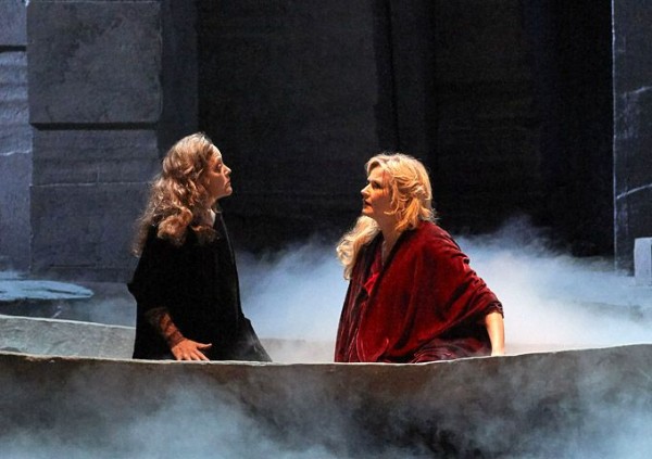 Schauspielerisch den stärksten Eindruck machte die Amme von Evelyn Herlitzius. Wie man schon bei ihrer Elektra in Aix-en-Provence sehen konnte, liegen ihr nun diese Charakterrollen immer mehr, wobei Herlitzius‘ Art zu singen mit ihrer exzessiven und auch physisch intensiven Schauspielkunst zu einem starken holistischen Eindruck verschmilzt, auch wenn eben nicht ständig Schönklang geboten wird. Der ist aber ohnehin bei diesen Charakter-Rollen nicht die Hauptsache. Dafür hatte sie ja auch die Nylund neben sich. Sebastian Holecek sang einen klangvoll kräftigen und rollenerfordernd autoritär bestimmenden Geisterboten. Schade, dass er beim ersten Auftritt ebenso wie die Amme zunächst kaum zu sehen war, weil sie kein Licht bekamen. Auch im weiteren Verlauf war die Lichtregie von Bertrand Couderc eher enttäuschend. Maria Nazarova ließ als Hüter(in) der Schwelle und Stimme des Falken ihren glockenreinen Sopran hören.