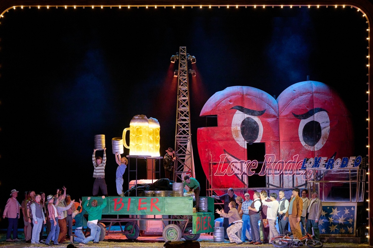 Das böhmische Dorf wurde also zum schäbigen Rummelplatz, Die Bühne von Robert Schweer ist in dauernder Umbaubewegung, vollgestopft mit mehr oder minder Schrott, Riesen-Bierhumpen und riesigen Würsten, selbstverständlich auch Klo-Häuschen, und besonders überflüssig mit einem Love-Rodeo, wo ein Cowgirl auf einem Lederbullen reitet.