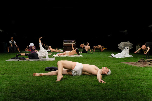 Für einen surrealen Satz wie „Diese Wiese ist sechs Küsse breit“ muss man ja schon dankbar sein. Selbst die Schauspielerin Silja Bächli, die die Sprechrolle übernommen hat, rettet die Chose nicht – zumindest nicht für den Zuschauer, der ein wenig mehr Konsistenz, ein wenig mehr Spannung, ein wenig mehr Zusammenhang und vor allem: TANZ erwartet. Der ist an diesem Abend so gut wie nicht. „Das sind Tänzer“? Mag sein – aber warum tanzen sie nicht? Warum ziehen sie sich nur aus, schlüpfen immer wieder immer wieder unter Decken, lüften ihre Hintern (war das 1980 wirklich modern??), verrenken sich auf der grünen Wiese und lassen das Rehkitz Rehkitz sein? Eine ironische Rede an einen Stuhl aber ersetzt nicht das TANZtheater. Sie zeigt nur, dass es Pina Bausch auf etwas Anderes ankam. So, wie sie ihre selbsttherapeutischen Bemühungen gezeigt hat, mag es das zum Jubeln aufgelegte Publikum schon zehn Sekunden nach dem Schluss zu Standing Ovations hinreißen, die genauso bekloppt sind wie vieles, was wir an diesem Abend gesehen haben.