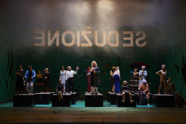 Gaetano Donizettis Oper L’elisir d’amore hatte am 22. Februar seine Premiere in Wuppertal. Wer eine klassisch inszenierte Opera buffa erwartet, der wird zunächst irritiert sein. Die Besucher erleben eine farbenfrohe, moderne Überraschung mit viel Lokalkolorit. Stephan Prattes (zuständig für Regie und Bühnenbild), der hier sein Debüt als Opernregisseur gibt, hat sich durch Originale, berühmte Personen, Begebenheiten und Sehenswürdigkeiten aus Wuppertal inspirieren lassen und so eine frische, moderne Inszenierung auf die Bühne gebracht. Der Schwerpunkt wird auf die Verführung gelegt, was ja vielfältig ausgelegt werden kann und wird. SEDUZIONE (die Verführung) steht dann auch in großen Lettern über der Handlung. Bereits während der Ouvertüre wird der Begriff Seduzione mit einer Erklärung seiner Bedeutung via Laufband auf den eisernen Vorhang projiziert. Verführung gibt es überall, in der heutigen Zeit wird Mensch verführt und dadurch manipuliert durch Medien, so spielt auch das Handy hier eine große Rolle. Nemorino hantiert während der gesamten Oper immer wieder damit herum, liest begierig das, was er dort findet, nimmt sogar die Anleitung, wie der Liebestrank anzuwenden ist, in einem Video auf.