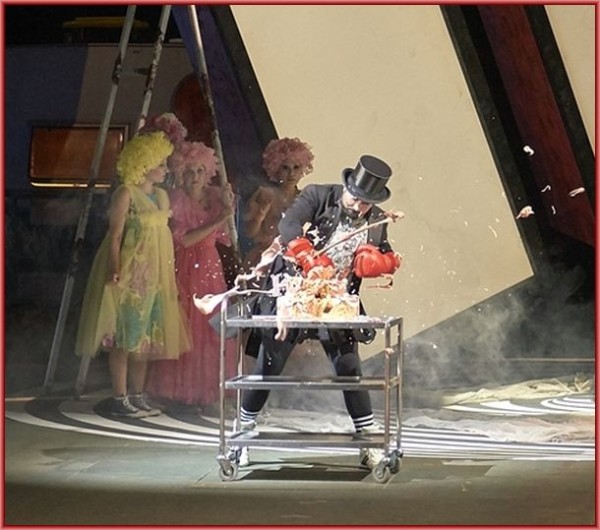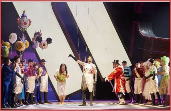 Erster Hinweis darauf sind die vielen bunten zirzensisch gekleideten Darsteller, die schon im Vorfeld das Haus durchschwirrend und überall und von fast jedem Besucher laut kichernd Selfies knipsen, oder zumindest so tun. Es sind dieselben Selfiemacher, denen wir später in der Oper auf Schritt und Tritt begegnen werden – quasi der Fil Rouge dieser Inszenierung. "Dezent angedeutete Gesellschaftskritik" murmelt mein Sitznachbar, als das gefühlte 571. Foto auf der Szenerie gemacht wird. (Anmerkung: die Produktion wird weder von Samsung, Sony oder Apple gesponsert – was meiner Meinung nach eine Schande ist). Außerdem gibt es Luftballons in Hülle und Fülle und Form, welche sich auch für Werbeaufdrucke geeignet hätten… Es gibt auch noch reichlich Konfetti – warum eigentlich keine Luftschlangen?