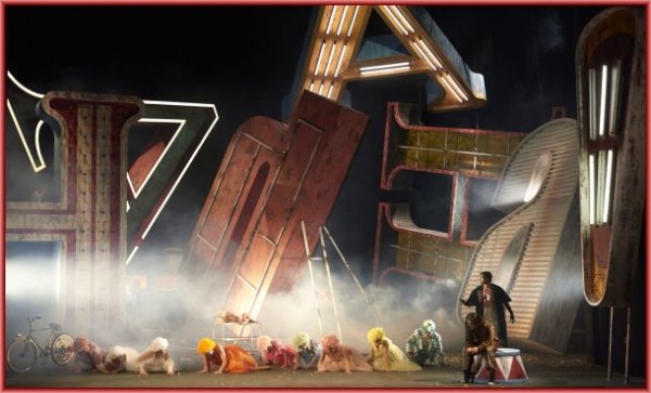Stellen Sie sich vor, Sie räumen abends das Zimmer Ihrer kleinen Kinder auf. Ordnung ins Chaos kriegt man nur – ich spreche da aus eigener Erfahrung – wenn man die ganzen tausend kleinen Figürchen, Legomännchen, Püppchen, Autos, Clowns….etc in einen großen Pappkarton einsammelt. Dann schütten Sie den ganzen Krempel auf einer kleinen Bühne aus und legen die Opernscheibe "Die Liebe zu den drei Orangen" von Prokofjew auf. Zufällig kommt die imaginäre Fee vorbei (vielleicht die bezaubernde Jeannie), kniept mit den Augen und alle Figuren leben plötzlich. Jeder macht was er will bzw. was ihm gerade einfällt; zur Musik muß es nicht unbedingt passen. So – jetzt haben Sie das Bühnenkonzept verstanden, hoffe ich. Sehenswert ist aber durchaus…