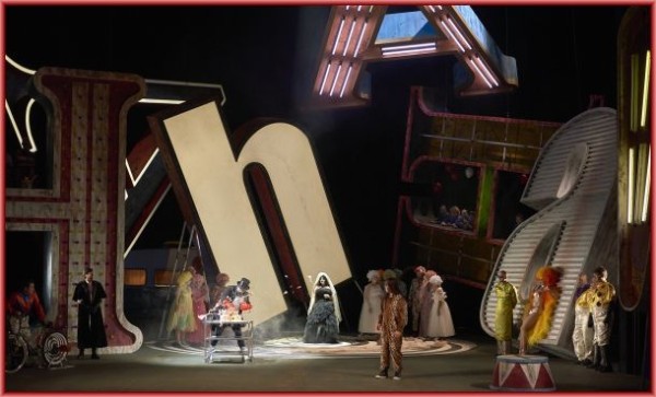 Die „Orangen“-Oper ist zu Teilen auch ein Diskurs über das Theater, was die deutsche Textfassung von Werner Hintze unterstreicht. Insofern erscheint es legitim, dass Regisseur Sebastian Welker (Jahrgang 1983, gelernt hat er u.a. bei Willy Decker) den Publikumsstreit des Prologs (heitere oder tragische Bühne?) in die eigentlichen Handlungsakte hinein ausdehnt. Die von überdimensionalen Buchstaben geprägte Bühne (Rifail Ajdarpasic) sowie die von optischer Fantasie nur so überbordenden Kostüme (Doey Lüthi) machen dieses Konzept von Anfang an sinnfällig. Hier gibt es beispielsweise eine aus dem Geschehen herausgehobene „Chorprobe“ unter dem realen Chorleiter Markus Baisch, dort simuliert ein Ventilator den Wind, welcher den Prinzen und seinen Begleiter Truffaldino zur Köchin ins Reich Kreonta bläst. Die zauberischen Wesen Fata Morgana und Tschelio sind bei Welker Sängerinnen, die sich – aufeinander eifersüchtig – um ein Theaterengagement bemühen. Dass Tschelio in der Wuppertaler Inszenierung eine Frau ist, hat mit der ungewöhnlichen Besetzung der Partie mit der transidenten Lucia Lucas zu tun, welche aber noch über ihren (sonoren) Bariton aus Männertagen verfügt. Zuletzt war sie auch die Stadträtin Lindorf in „Contes d’Hoffmann“.