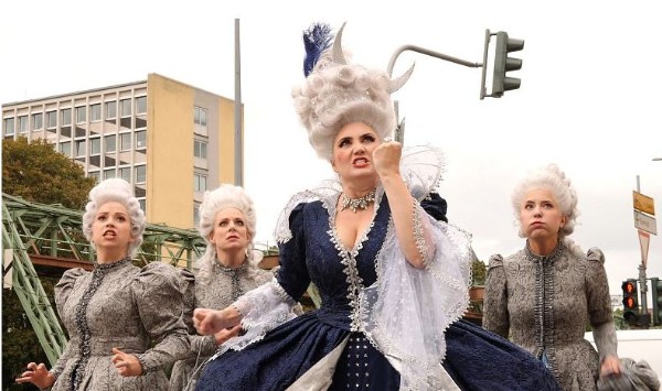 „Der Hölle Rache kocht in meinem Herzen“ – Ein Höllenquartett mit Elena Puszta, Joslyn Rechter, Iris Marie Sojer und der Königin der Nacht (Nina Koufochristou) am hellen Tage vor dem Finanzamt Wuppertal-Barmen – Foto © Jörn Hartmann