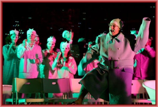 Aber optisches Rätselraten ist für den vierstündigen Abend pausenlos angesagt. Unmöglich, die Irrungen und Wirrungen all dieser Spielabläufe beschreibend zu bündeln und womöglich auch noch sinnvertiefen zu erläutern und aufeinander zu beziehen. Das ganze Tohuwabohu fängt damit an, dass Kerstin Brix die Wuppertaler Dramaturgin mimt und ihren Auftritt reichlich beschwipst beendet (doch wohl keine Anspielung auf die Autorin des Programmblatttextes?). Später sieht man die Stadträtin (sic) Lindorf auf einem Video, „Das Gesicht leihen ihr Margaret Thatcher und Angela Merkel, Politik der Kälte mit Mutti-Charme“ (Programmblatt). Uff!