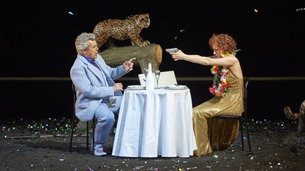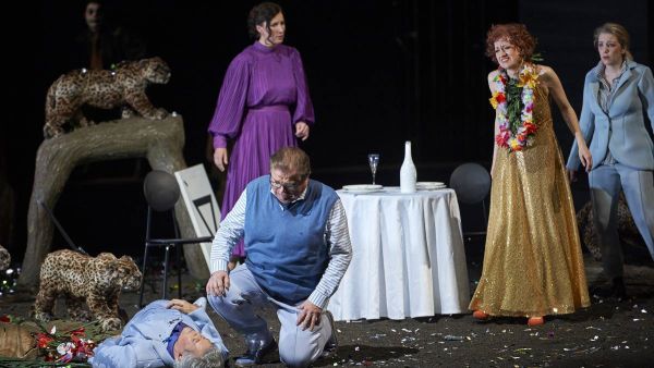 Elisa Limberg zeigt auf ihrer kleinen Drehbühne einige Leoparden-Figuren, welche über die Wirkung von animalischem Dekor in einem neureichen Etablissement indes nicht hinaus kommen. Aber auch sonst ist der Regisseurin nur sehr bedingt zu folgen. Man registriert im Rahmen einer ohnehin reichlich verwaschenen Personenführung viele hilflose Standbilder. Besondere Verlegenheit zeichnet sich bei der Figur des Alwa ab, was die etwas füllige Figur von Arnold Bezuyen unfreiwillig unterstreicht.