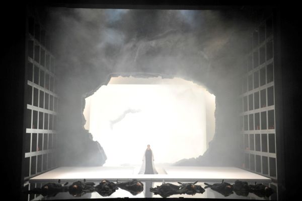 Der Chor absolviert einen Teil seiner Auftritte unnötigerweise vom Seitenrang. Die Bühne dreht sich, das Licht leuchtet, doch die Regie weiß nicht einen Deut für die Figuren zu interessieren; daran ändert weder das Papiergeschmeiße von großen Tisch des zweiten Aktes, noch die Stahlinstallation des dritten Aktes etwas. Wenn zwei Sekunden vor Schluß auch noch mit einem enormen Bühneneffekt aufgewartet wird (den ich, wenn ich ihn richtig verstanden habe, auch für zutiefst falsch halte), ist das nach zwei Stunden Langeweile zutiefst unbefriedigend.