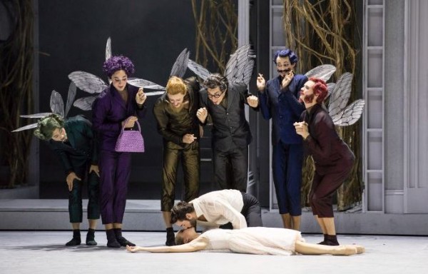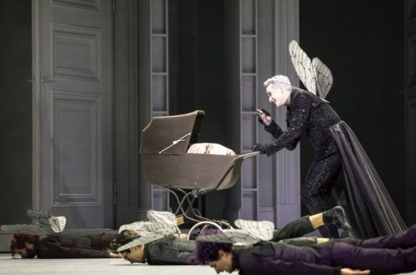 Den grössten „Coup“ setzt Spuck wohl mit seiner Sicht auf die Feen. Die Feen sollen also die Ziehmütter der Babys im Feenreich sein, bevor diese Kinder zu den Menschen gebracht werden. Das Eindringen der Menschen in dieses Feenreich wird gar nicht gern gesehen. Allerdings sind diese Feen allesamt mit Tinkerbell-Flügeln versehene Männer, was dem Ganzen einen etwas affektiert-tuntigen Anstrich verleiht, gemildert allerdings durch virtuoses, insektenhaftes Getrippel. Manchmal erklimmen die Feen die Wände und kleben dann wie geflügelte Insekten daran. All dies ergibt einige lustige Situationskomik, etwa wenn als Schlaflieder für die Babys Songs wie Tom Jones‘ Sex Bomb geträllert werden, und Christian Spuck schafft die diffizile Gratwanderung zwischen affektierten Drama-Queens und schwuler Elternliebe gerade noch ohne abzustürzen. Diese Feen scheinen berühmten Persönlichkeiten zu ähneln, aber vielleicht verrenne ich mich da. Jedenfalls erinnerte mich z.B. die Goldfee (George Susman) an Don Quijote. Umwerfend gut wirft sich Jan Casier als Fliederfee mit rosa Handtäschchen in die Rolle. Da stimmt jede (tuntige) Handbewegung, jeder Augenaufschlag, das Richten der Perücke, das Wegwischen eines Flusels auf dem Revers – eines Ballett-Oscars würdig ist diese Darstellung! Aber erfrischend ist, dass all diese Feen in ihrer Affektiertheit von Christian Spuck doch sehr individuell gezeichnet werden:In den Variationen brillieren Iacopo Arregui als Silberfee, Dominik Slavkovský als Blaue Fee, Wei Chen als Grüne Fee und Mark Geilings als Rote Fee. Dazu kommen, wie erwähnt, die beiden Hauptfeen: Jan Casier als Fliederfee und William Moore als Carabosse (dämonisch schwarze Fee).