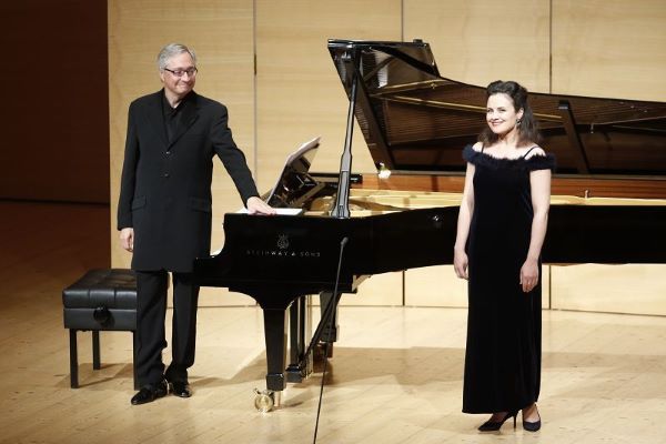 Bei Mozart kamen die Vorzüge der Sängerin noch mehr zum Tragen: Unendlich scheinender Atem (u.a. „Abendempfindung an Laura“), saubere Tonansätze in allen Lagen, Flexibilität bei Verzierungen und unangestrengte Spitzentöne. Bei Richard Strauss schien sie sich ebenso wohl zu fühlen: Da glänzte wirklich der „lieben Augen Schein“ in dem seltener zu hörenden, ausdrucksstark gesungenen „Leises Lied“ und auch Humor kam nicht zu kurz („Hat gesagt – bleibt’s nicht dabei“), während „Heimliche Aufforderung“ mit gewaltiger Steigerung zu einem der Höhepunkte des Abends wurde. In den Liedern von Gabriel Fauré trafen die beiden Künstler den elegant-französischen Stil gut: Der Walzer „Le papillon et la fleur“ und „Chanson d’amour“ gelangen sehr gelöst wie auch das wunderbar gesteigerte „Notre amour“. Das Programm wurde mit drei Mignon-Liedern beendet, aus denen „Heiß mich nicht reden“ als tolles piano-Lied mit sanften Einsätzen gestaltungsintensiv herausragte; bei „Suleika I und II“ kamen saubere Intervallsprünge und dichtes Legato der Sopranistin und die hohe Begleiterkunst des Pianisten erneut zum Tragen. Das Publikum bedankte sich begeistert für den tollen Abend und wurde mit zwei Zugaben belohnt, wobei der nach dem langen Programm immer noch vorhandene immense Atemstrom, den Schuberts „Nacht und Träume“ braucht, Bewunderung verdiente. (ME)