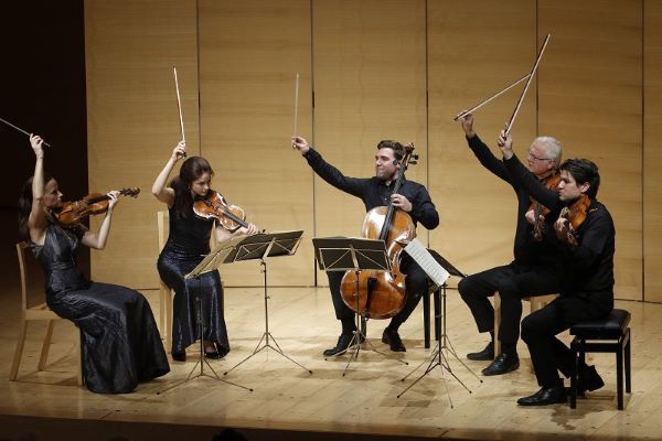 Nach der Pause erklang Schuberts 1824 uraufgeführtes „Rosamunde“-Quartett , dessen Name auf das bekannte Thema im Andante zurückgeht, das der Zwischenaktmusik zum Schauspiel „Rosamunde“ entnommen ist. In der gelungenen Interpretation des Minetti Quartetts fiel besonders die erfolgreiche Bemühung um Schönklang auf, ohne dabei zu vernachlässigen, dass es in den dramatischen Phasen auch einmal schroff klingen darf. In allen Sätzen zeigte sich das hohe streicherische Können der Musiker, die sich ja längst in die Spitzenklasse der Streichquartette gespielt haben; so waren die vielen virtuosen Stellen kein Problem für sie, indem sie diese präzise in die Interpretation der einzelnen Sätze einbrachten. Dass perfektes Zusammenspiel durch permanentes Aufeinander-Hören selbstverständliche Voraussetzung des Erfolgs ist, war bei dem immer noch jung wirkenden Quartett jederzeit spürbar. Aber auch die Ausdeutung des musikalischen Gehalts des Rosamunde-Quartetts konnte gefallen: So gab es im Andante einige passend fahle Klänge und im Menuetto eine ausgesprochen geheimnisvolle Stimmung, die sich im Trio in schwingende Kantilenen auflöste. In den allgemeinen Schönklang des Finales passten sich die virtuos servierten Triolenläufe der 1. Violine und der Viola bestens ein – insgesamt eine klug durchdachte und bestens präsentierte Interpretation. Für den starken Beifall bedankte sich das Minetti Quartett mit dem äußerst spritzig präsentierten Finale aus Antonin Dvoraks „amerikanischem Quartett“. (GE)