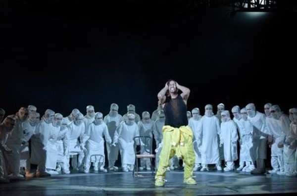 Das Ganze spielt sich in einer Spaßgesellschaft ab, die nur auf vordergründiges Vergnügen bedacht ist und deren Kostüme im Verlauf des Abends immer verrückter anmuten. Sie kennt kein Innehalten und krankt an dem Mangel an Ernsthaftigkeit. Ewig währender Spaß und nicht enden wollende Lustigkeit werden hier als Krankheit der Gemeinschaft aufgezeigt. Gott spielt in diesem Zusammenhang keine Rolle mehr. Gott ist tot. Hier wird von Ollé ein gehöriger Schuss Nietzsche ins Spiel gebracht. Der Mensch hat sich zu seinem eigenen Gott gemacht. Irgendwie geartete Projektionsflächen für seine Wünsche und Sehnsüchte – das ist Feuerbachs Verständnis von Gott – braucht er nicht mehr. Die Gesellschaft beginnt sich aus sich selbst heraus neu zu definieren und damit ihre innere Leere zu überwinden. Sie stellt sowohl das Gute als auch das Böse dar. Die Folge ist ein an Freud angelehnter innerer Kampf, in dem die beiden Prinzipien ausgefochten werden. Das war alles gut durchdacht und trefflich umgesetzt. Dabei ließ die Regie dem Zuschauer noch genügend Raum für eigene Assoziationen.