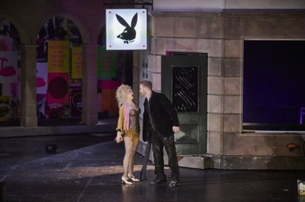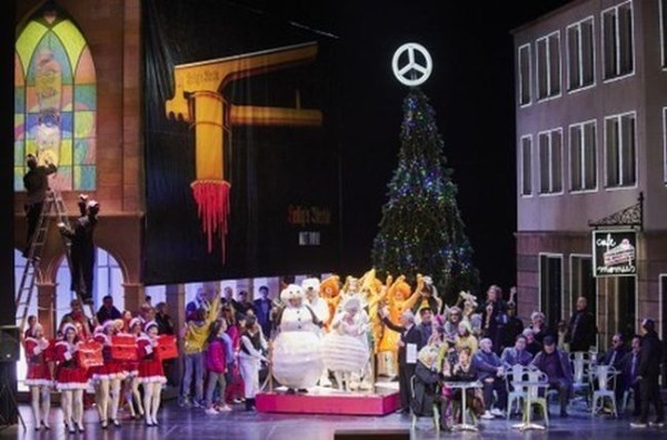 Das in seiner bunten Opulenz stark überzeichnete Bild des von Paris auf den Stuttgarter Weihnachtsmarkt verlegten zweiten Bildes mit all seinen Nikolaus- und Engelsfrauen, Pinguinen, Eisbären, Schneehasen, Party-Service-Vertretern, einer Pfauendame und einem Transvestiten sowie der sommerlich leicht und farbig gekleideten Kinderschar wird zum Sprachrohr für die durchaus angebrachte Konsumkritik von Regisseurin und Bühnenbildner. Mit dem Mercedes-Stern als Krone eines Weihnachtsbaumes und einer ausgeprägten, in der Luft schwebenden und rötliches Fleisch ausspuckenden Spätzlepresse mit der Aufschrift Heilig’s Blechle nimmt Stefan Strumbel augenzwinkernd die schwäbischen Markenzeichen auf die Schippe. Diese Eindrücke atmen ganz den Geist des Bühnenbildners. Viele dieser Motive kennt man von ihm bereits. Und sein schon oft ins Feld geführtes Lieblingsthema Heimat wird auch hier wieder zu Genüge thematisiert. Dass er seine Heimat liebt, verkünden im dritten Bild Schriftzüge an Wänden und Containern. Bezogen auf den Ansatzpunkt von Andrea Moses meint dieser Einfall das Zugehörigkeitsgefühl zu einem bestimmten Kunstbegriff.