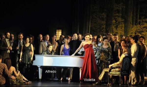 Nach Ende des Vorspiels stürmt die Spaßgesellschaft herein, Sekt wird gereicht – Violetta trägt nun eine strahlend-rote Abendrobe. Ein Flügel wird herein geschoben und Alfredo (der offenbar als eine Art Pressefotograf an dem Fest teilnimmt, fotografiert und seine Fotos herzeigt) wird von der Gesellschaft genötigt, sich an den Flügel zu setzen und sein Trinklied anzustimmen. Und man kann sich nicht dem beklemmenden Eindruck entziehen, dass Carsen ganz bewusst auf der Bühne das spiegelt, was man im prächtigen Zuschauerraum des Fenice-Theaters auch sieht: ein elegant gekleidetes internationales Publikum, das posiert und geradezu in einem Blitzlichtgewitter sich selbst fotografiert(Gott sei Dank nur vor Beginn der Vorstellung!). Die Parallelen zwischen Publikum und Bühne sind unübersehbar. Die Personenführung durch Carsen ist ausgefeilt – jeder auf der Bühne, ob Chormitglied, Neben- oder Hauptdarsteller, ist eine individuell gezeichnete Figur ohne hohle Operngesten – großartig!