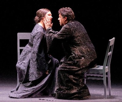 Kosky hat sie gewählt und zeigt uns in völliger Finsternis eine Art Landebahn für Flugzeuge, bei der die Mittelbefeuerung ausgefallen ist, sowie einen ovalen Lichtkegel, der allerdings tatsächlich nicht aus der darüber schwebenden großen Salonlampe strahlt, in dem aber das ganze Schicksal von Macbeth und Lady auf zwei grauen Holzstühlen über die Bühne geht. Denn nur auf sie kommt es Kosky an, und wir erleben wieder einmal die Dichotomie zwischen der theoretisch fundierten Konzeptualisierung eines Opernregisseurs und den Herausforderungen und Möglichkeiten eines großen Operntheaters. So, wie sich der „Macbeth“ hier in Wien nun präsentiert, könnte er auch in einer Kammeroper stattfinden, möglicherweise sogar mit größerer Intensität, weil das gesamte Publikum viel näher an den Protagonisten säße und damit die starke Emotionalität und Mimik der beide Hauptfiguren noch direkter erleben könnte. Aber auf der Riesenbühne der Wiener Staatsoper? Man schaut den ganzen Abend in ein schwarzes Loch, und erst langsam deutet sich die Randbefeuerung der Landebahn als banaler Richtungsweiser für die Auf- und Abgänge der als nackte Statisten auftretenden Hexen und des schwarz bekutteten Chores in der Finsternis an. Dabei hatte ich vorübergehend die Vorstellung, dass sich das Schicksal der beiden im Laufe des Abends auf dieser Straße im Sinne eines chronologischen Fortschreitens offenbaren würde, in Assoziation an die geniale „Straße des Lebens“ von Harry Kupfer in seiner „Ring“-Produktion in Bayreuth in den 1980er Jahren.