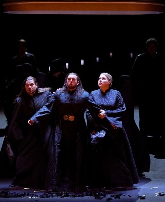 Auf der anderen Seite ist aber zu sagen, dass gerade die direkte Konfrontation Macbeths mit den Hexen große theatralische Intensität und damit auch Bedeutungsschwere für den Fortgang des Geschehens birgt, welche dem Zuschauer in dieser Position völlig vorenthalten bleibt. Es scheint mir auch zu wenig, über die Länge des Stücks, den „Macbeth“ nur als Traum des Macbeth darzustellen. Auch wenn Banco, Macduff und Malcolm durchaus keine großen Rollen haben, spielen doch auch sie im ultimativen Verständnis des von der Lady und Macbeth verbreiteten Grauens eine westliche Rolle, sodass eine klarere dramaturgische Einbindung dieser Figuren wie eben auch der Hexen in der Oper Sinn macht und schon oft gemacht hat. Dazu muss man gar nicht in eine politisch aktuelle Regiekonzeption verfallen, wie Kosky es im Interview auch nachvollziehbar ausschließt. Klaus Grünberg schufen ihm Bühnenbild und – kaum benötigtes – Licht, und die bis auf das weiße Todesgewand der Lady durchgängig schwarzen Roben stammen von Klaus Bruns. Sylvie Döring hat das Zürcher Stück für Wien einstudiert.