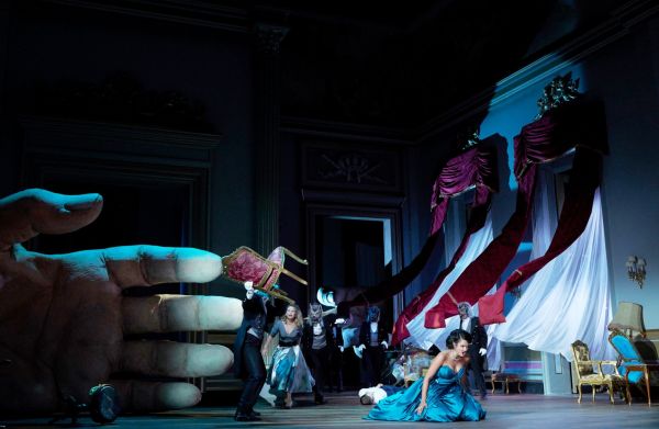 Das Regie-Duo Moshe Leiser & Patrice Caurier ließ Christian Fenouillat eine Zimmerdekoration bauen, die glücklicherweise nicht so öde ist wie üblicherweise bei Guth oder Loy. Das ist schon ein Barockpalast (wenn die Herrschaften darin auch mehr oder minder in Gewändern der fünfziger Jahre herummarschieren: Kostüme Agostino Cavalca), im ersten Akt noch als Lazarett benützt (es ist schließlich Krieg, und das muss heutzutage unbedingt mitinszeniert werden), dann, nach dem Sieg, schon in imperialer Pracht. Schräg im doppelten Sinn wird es dann ab dem 3. Akt, wenn Medea ihre Zauberkünste gegen die Rivalin entfesselt – da rutschen nicht nur die Stühle ganz drollig herum, da werden später auch Riesenhände hereingeschoben, die Vorhänge heben sich dramatisch. Alles, damit man auch Bilder hat, die surreal und damit „modern“ wirken… Bedenkt man, wie vergleichsweise kurz dieser Effekt bleibt, möchte man die kaufmännische Abteilung des Hauses nicht fragen, was er gekostet hat.