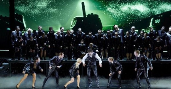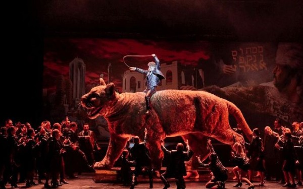 Die Kostümbildnerin Christina Schmitt konnte für diese Produktion aus dem vollen schöpfen. Während die „grünen“ Juden mit ihren altertümlichen weissen Kniestrümpfen und den schwarzen Quäker-Hüten und die Perser um ihren Anführer Cyrus in schwarzem Leder-Outfit uniformiert (monotheistisch!) wirkten, waren die Babylonier am Hof Belshazzars ein bunter Haufen (polytheistisch!), dessen Kleider von den dauerbekifften archaischen Naturmenschen über Schamanen und Beduinen bis zu Operettenuniformen und Cleopatra in Sneakers reichten. Am Ende, wenn sich alle in der Lobpreisung des gerechten“wahren“ monotheistischen Gottes üben, erscheint die Kronprinzen-Mutter Necotris, von Cleopatra zur Nonne gewandelt, in schwarzem Leder-Nonnenrock mit schickem weissem Kopfputz, als hätte ein avantgardistischer Modedesigner ihre Kluft entworfen. Daneben gab es viel Trockeneis (die Fluten des Euphrat, in welche die Perser ihre Kartonbecher schmeissen …), ein Modell der Stadt der Zukunft (inklusive kaputten Autos, durch Puppen dargestellte Sexszenen), aufgezeichnete Videoclips und solche in Echtzeit, Karton-Kampfflugzeuge und apokalyptische Filmsequenzen noch und noch, vom Desert-Storm über Bombardierungen von Headquarters zu gigantischen Naturkatastrophen und einer Götterdämmerung durch einen Feuerball, die jedem Monumentalfilm gut angestanden hätte. Pralles Spektakel noch und noch – doch ständig stellte man sich die Frage, was das soll, wo die Gefühle der Personen bleiben. Wohin uns Sebastian Baumgarten lenken wollte, wurde nicht ganz klar. Macht er sich über die momentane „grüne“ Welle lustig? Ist eh alles Fake? (Er verheimlicht die Tricks der Filmindustrie ja keineswegs, alles wird immer gleich als „falsch“, als Fake aufgedeckt, so auch die gigantische Löwin, auf der Cyrus in Babylon einzieht, bei der man – sobald sie sich dreht – das menschliche „Herz“ sieht, genau wie Daniel in seiner Vision von den vier grossen Tieren.) Früher hat man sich über Theater auf dem Theater Inszenierungen geärgert, heute ist oft Fim im Theater anzutreffen, bald werden wir wohl nur noch virtual reality Inszenierungen aschauen dürfen.