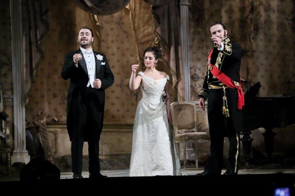 von Marco Tutino, eines Auftragswerks, das hier am 15.7. seine Uraufführung erlebt hatte. Das vom Komponisten selbst verfasste Textbuch basiert auf dem 1998 mit einem Sensationserfolg wieder aufgelegten Roman „Die Glut“ von Sándor Márai, in dem zwei alte Herren vor dem Hintergrund des 2. Weltkriegs über ihre Liebe zu dem selben Mädchen zu Zeiten der untergehenden österreichisch-ungarischen Monarchie sprechen: Krisztina war dann die Gattin von Henrik, einem überzeugten Militär geworden, was seinen Freund Konrad, einen Zivilisten, damals veranlasst hatte, sein Leben in fernen Ländern weiterzuführen. Da sich Tutino für ein Werk von der Dauer von achtzig Minuten entschieden hatte, war er angesichts der psychologischen Komplexität der Geschichte natürlich gezwungen, gewisse Nuancen zu übergehen. Dennoch ist es ihm gelungen, den Erzählstil des Romans beizubehalten, der immer wieder zwischen in der Gegenwart und in der Vergangenheit spielenden Szenen changiert.