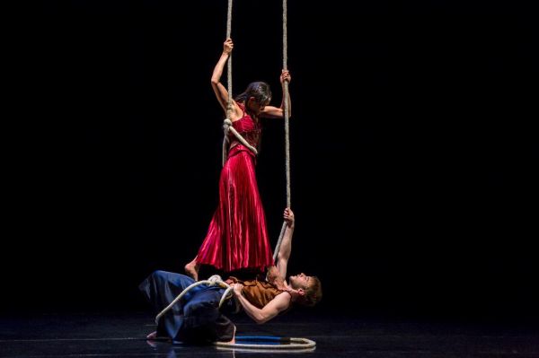 Schade, dass außer über Philippe Cohen und Joelle Bouvier nichts über die Haupttänzer im ohnehin recht spartanischen Programmhaft stand – sie hätten es wahrlich verdient gehabt. Die blutjunge Madeline Wong tanzte einmal eine verinnerlichte, ein anderes Mal ekstatische Isolde, sehr flexibel in den Hebeformationen durch Tristan und das Corps de ballet und immer auch mimisch im Ausdruck der jeweiligen emotionalen Situation. Schon das erste Bild von ihr – noch während des Vorspiels – als phantomartig über die Bühne fliegende Isolde mit wallendem rotblauem Gewand war eine romantische Augenweide. Überhaupt hatte das Corps de ballet mit hier 18 Tänzern und Tänzerinnen eine wesentliche Rolle zu spielen, mal als Zeugen des Geschehens um die unglücklich endende Liebe zwischen Tristan und Isolde, mal als die Handlung vorantreibende Truppe mit interessanten Gruppenformationen und Einzeldarbietungen.